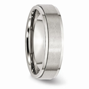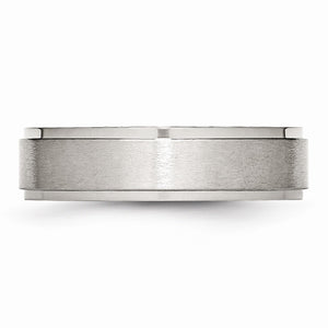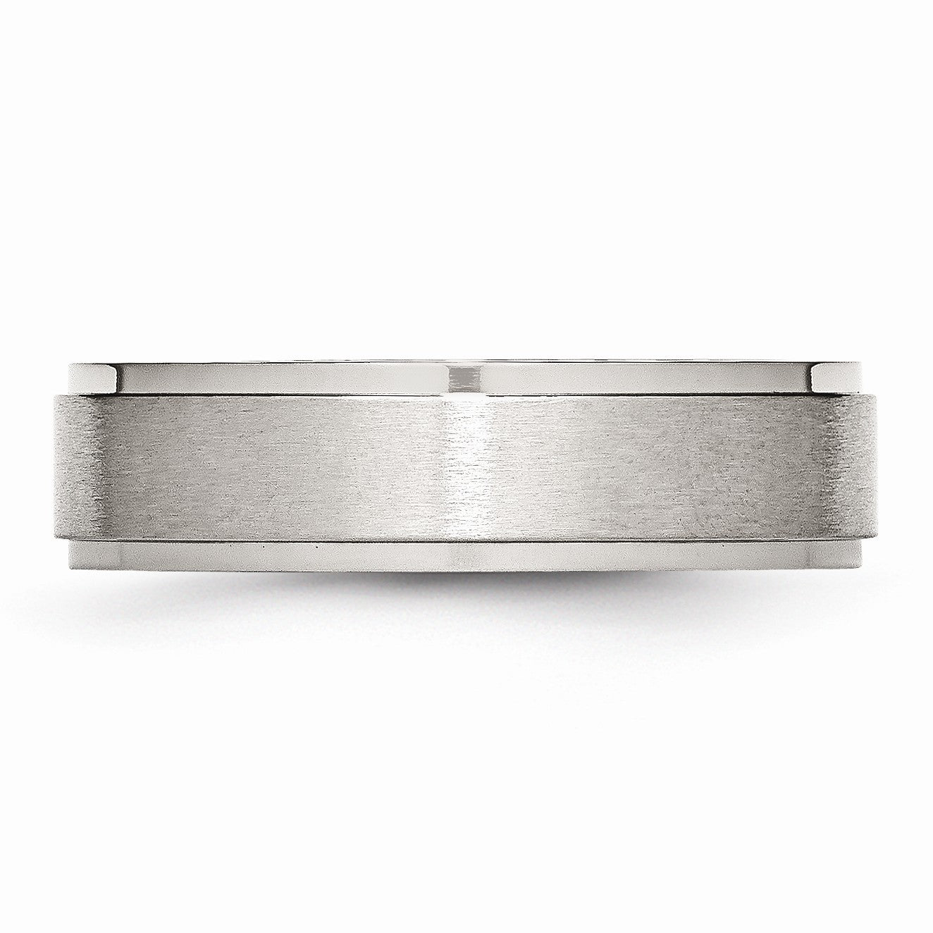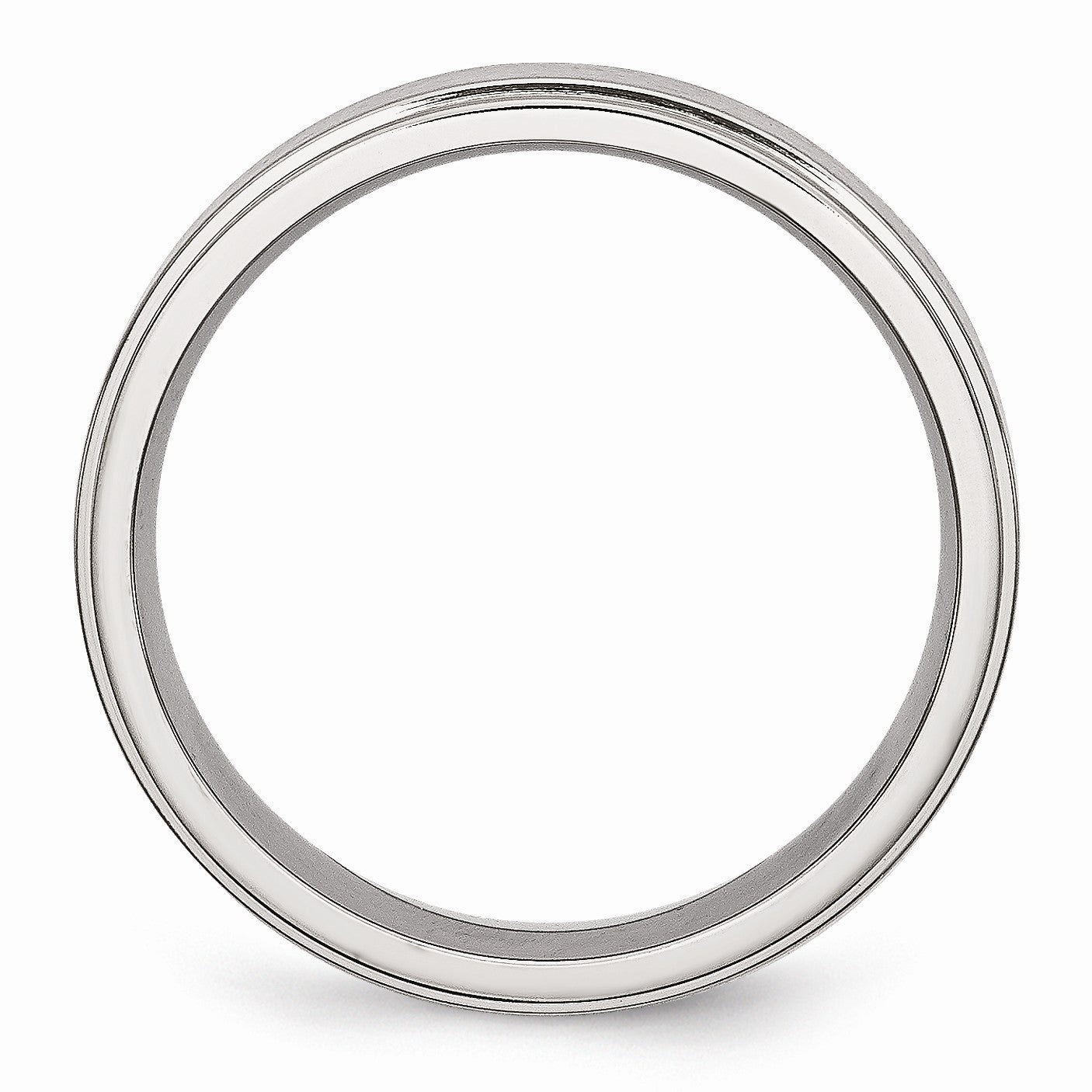 This contemporary, unisex ring is fashioned from 316L stainless steel and features a bushed center with polished, ridged edges. The band measures 6mm in width and the comfort fit design is perfect for everyday wear.