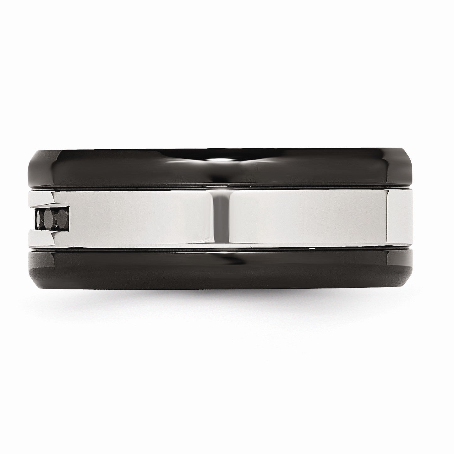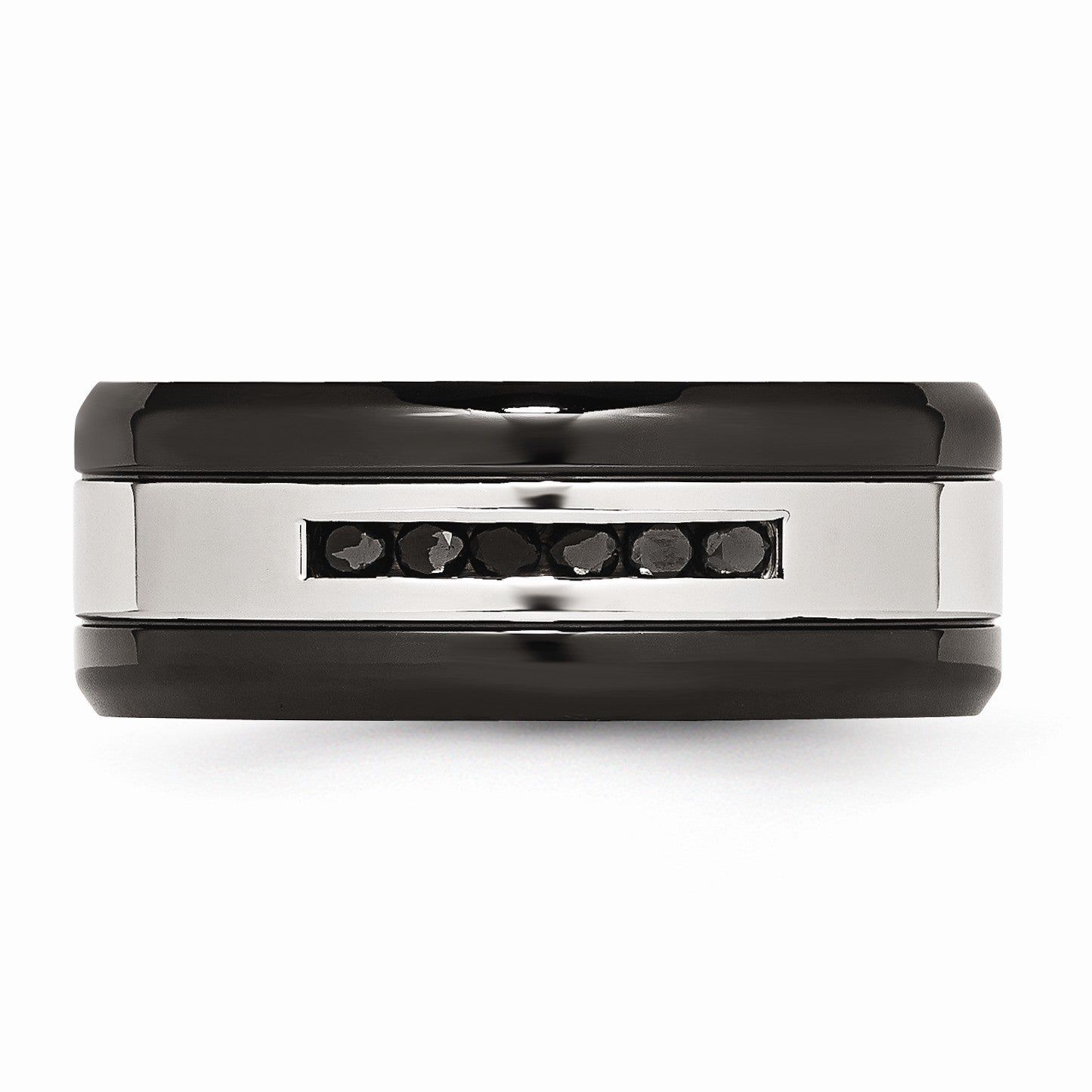 Impeccable style and design, this two-tone 316L stainless steel ring features beveled edges, a comfort fit interior and is channel set with six black diamonds totaling 1/4 carat. The polished and black-plated band measures 9mm in width. Wide bands fit tighter on the finger, so you might want to consider moving up a size for a more comfortable fit.