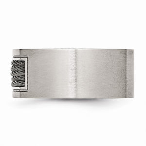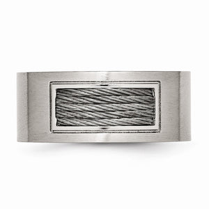 Refine your style with a distinctive ring crafted from 316L stainless steel that mirrors your unique personality. This 10mm flat band features gray cable inlays, a brushed and polished finish and rounded inside edges. Wide bands fit tighter on the finger, so you might want to consider moving up a size for a more comfortable fit.