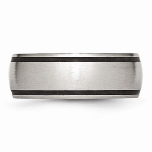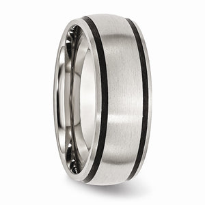 • This contemporary, unisex ring created from 316L stainless steel features a trendy, satin brushed finish with black rubber accent stripes. The domed band measures 8mm in width and has a standard fit shank. Available in whole and half sizes 6-13.