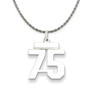 Celebrate your favorite sports player, lucky number or milestone date in your life with a prominent rhodium-plated sterling silver charm. Each polished number is approximately 18mm (11/16 inch) in length, which is finished with a 2mm top bar and a classic jump ring. Includes a flexible and strong diamond cut rope chain. This stunning chain is 2.25mm in width, 26 inches in length and features a sturdy lobster claw clasp. The chain is crafted in Italy.