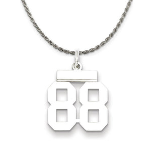 Celebrate your favorite sports player, lucky number or milestone date in your life with a prominent rhodium-plated sterling silver charm. Each polished number is approximately 18mm (11/16 inch) in length, which is finished with a 2mm top bar and a classic jump ring. Includes a flexible and strong diamond cut rope chain. This stunning chain is 2.25mm in width, 22 inches in length and features a sturdy lobster claw clasp. The chain is crafted in Italy.