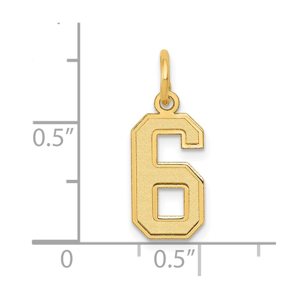 Celebrate your favorite sports player, lucky number or milestone date in your life with a prominent 14k yellow gold charm. This laser-cut satin and polished number is approximately 12mm (7/16 Inch) in length and is finished with a classic jump ring that will accommodate up to a 3mm chain. Made in the U.S.A. Chain not included.