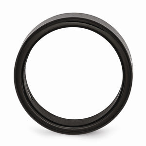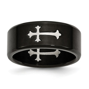 Prominently displayed on either side of this 8mm stainless steel flat band is a polished fleur-de-lis cross. The black-plated surface is created with an advanced process that fuses color to the metal to ensure hardness and lasting durability.