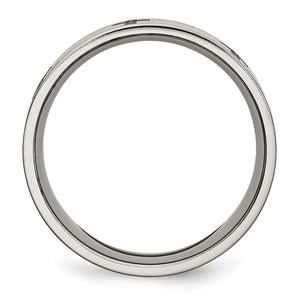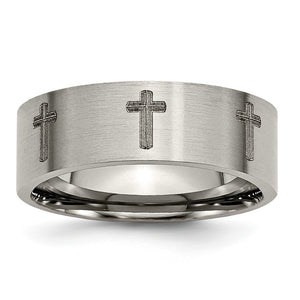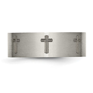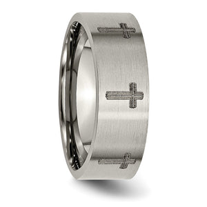 Refine your style with a distinctive ring crafted from titanium that mirrors your unique personality. This 8mm width flat band features a laser etched cross design with a brushed finish and a standard fit shank. Suitable for engraving.