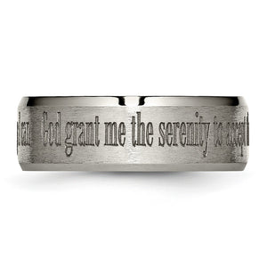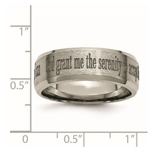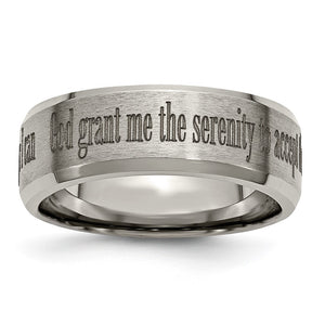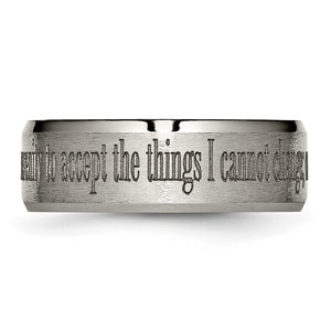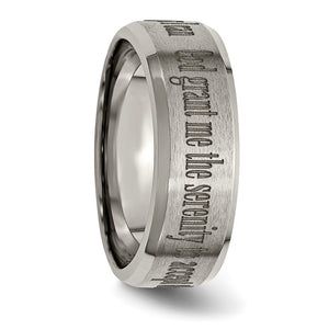 Refine your style with a distinctive ring crafted from titanium that mirrors your unique personality. This 8mm width flat band features a laser etched Serenity Prayer design with a brushed center, polished beveled edges, and a standard fit shank.'God grant me the serenity to accept the things I cannot change; courage to change the things I can. Suitable for engraving.