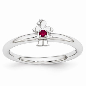Customize a look that reflects your own unique style with a synthetic birthstone ring designed to celebrate the special people in your life! This polished ring fashioned from tarnish resistant rhodium plated sterling silver features a 7 x 5mm girl prong set with a 0.5 carat created ruby for the month of July and a 2.5mm width band. Wear it alone or in meaningful combinations, guaranteed to fit together perfectly with all of the mix and match Stackable Expressions rings.