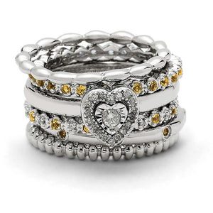 This set of six rings fashioned from rhodium plated sterling silver includes a rice bead band, a citrine eternity band, a diamond heart ring, a citrine and diamond eternity band, a citrine accent band and a polished beaded band. All diamonds are H to I in color and I3 in clarity. When worn all together this stack measures 13. Mm wide. This item is backordered. Please allow 7-10 business days for delivery