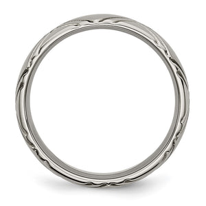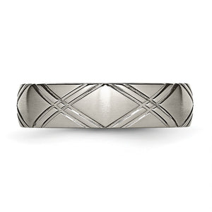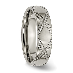 Simply striking, a distinctive style made from brushed and polished titanium featuring a half round shape with a crisscross patterned design. This unisex standard-fit band is approximately 6mm in width and suitable for engraving.