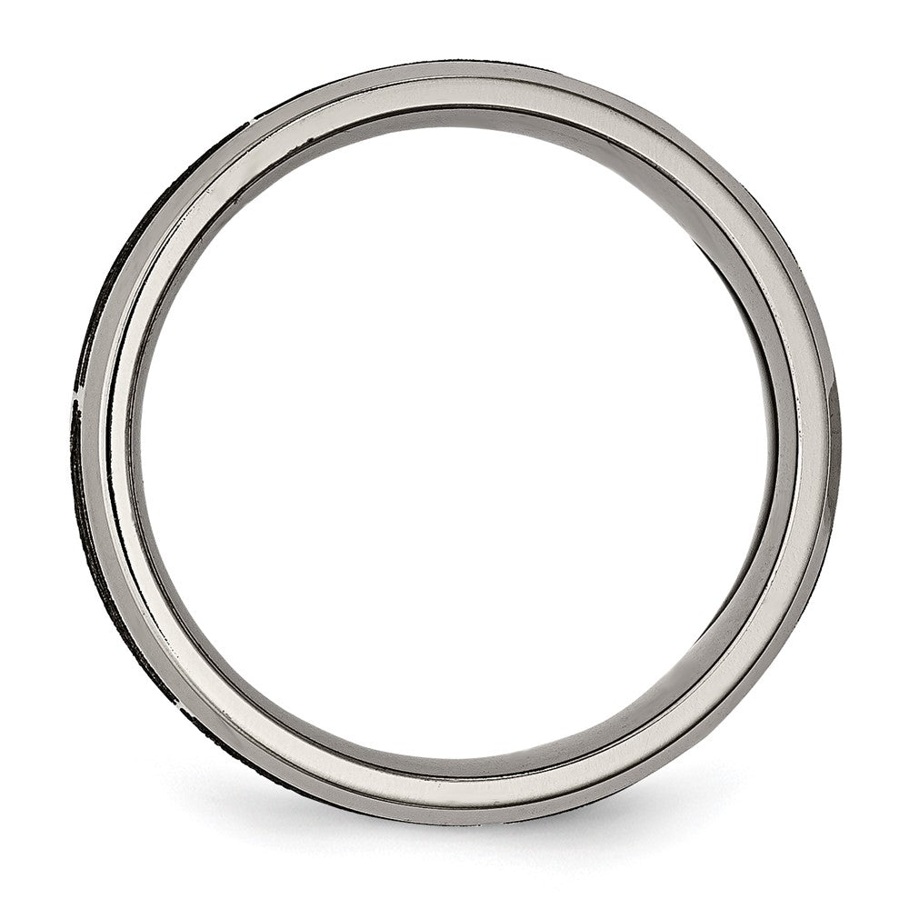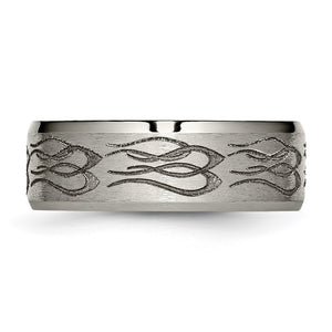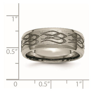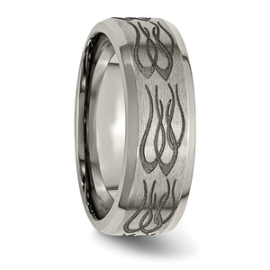 Refine your style with a distinctive ring crafted from titanium that mirrors your unique personality. This 8mm width flat band features a laser etched flame design with a brushed center, polished beveled edges, and a standard fit shank. Suitable for engraving.