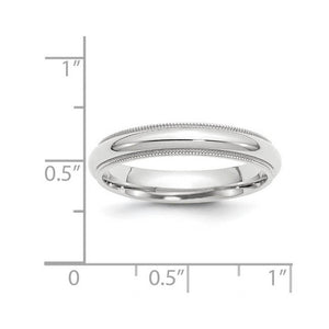 A tried and true favorite style featuring a half round or low domed center with milgrain edges created from rhodium-plated 10k white gold. This polished unisex band has a comfort fit shank, is approximately 2mm in thickness (standard weight) and 4mm in width. Suitable for engraving.�