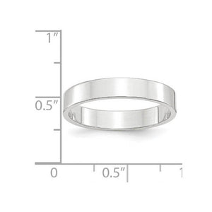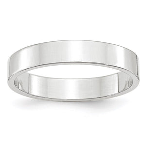 A sleek contemporary style band created in rhodium-plated 14k white gold with a polished finish. This unisex band features a flat profile, a standard fit shank, is approximately 1.2mmin thickness (lightweight), and 4mm in width. Suitable for engraving. Made in the U.S.A.
