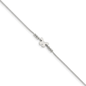 Anklets are a great way to add fun, flash and a feminine touch. This polished station design made from sterling silver features a 1mm width solid link curb chain, 2mm width beads and a 7 x 10mm flat butterfly link station. It is adjustable in length from 9 to 10 inches and closes with a spring ring clasp.
