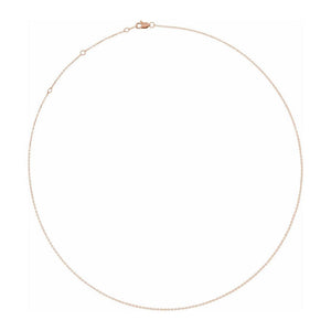 Simple traditional style, round open links of 14k rose gold interlock to form a beautiful cable chain that sparkles and shines in the light thanks to the diamond-cut finish. This solid link, delicate necklace is approximately 1.0 mm in width, adjustable in length from 16-18 inches and closes with a lobster claw clasp.