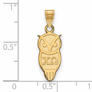 Show your greek life spirit with this Chi Omega Sorority pendant. It is crafted with yellow gold plated silver and without the bail is 17mm in height and 9mm in width (0.67 in x 0.35 in). With the bail, the measurements are 22mm in height and 9mm in width. We are a certified Collegiate jewelry retailer and this authentic item is licensed by the Chi Omega Sorority and Greek Life. This pendant is made the USA. Chain not included. This item is not currently in-stock. Once you place your order, please allow us 5 to 7 business days to make it for you.