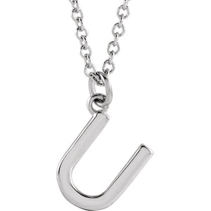 Express your individuality with this beautiful, small block initial necklace. Rendered in rhodium-plated 14k white gold, each letter measures approximately 9.5mm or 3/8 inch in length and dangles from a matching 14k white gold, solid link cable chain that is 1mm in width, 18-inches in length and closes with a spring ring clasp. Made in the U.S.A.