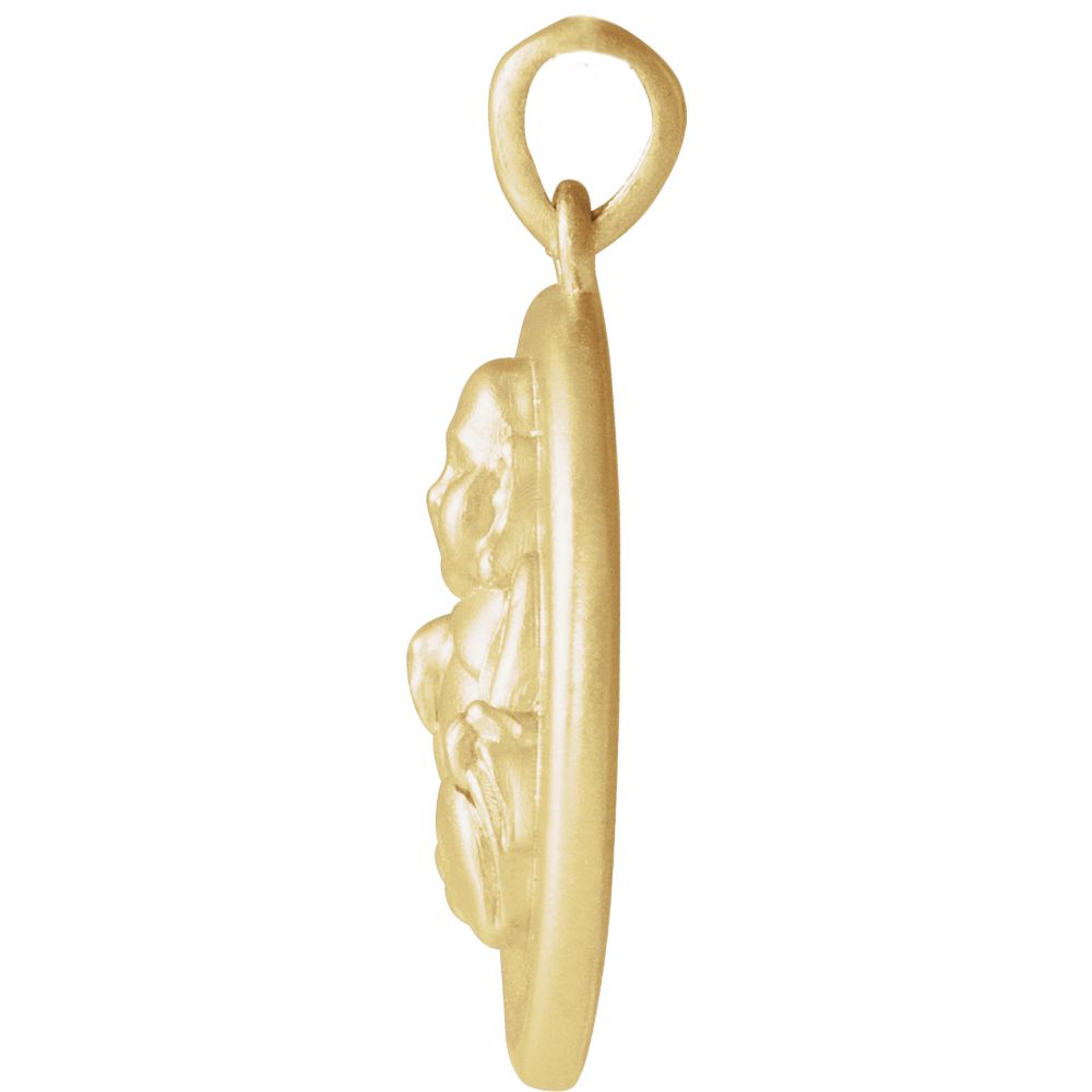 • Add peace and serenity to your day with a spiritual necklace. This small buddha pendant crafted in 14k yellow gold features a polished embossed design on a contrasting brushed background. The approximate pendant size is 16mm (5/8 inch) in width by 20mm (3/4 inch) in length with the bail. The chain passage dimensions of the bail is 3 x 2.25mm. This item does not include a chain.