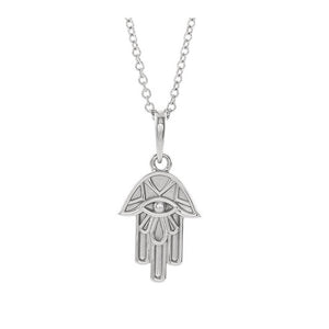 The hamsa hand is a famous symbol in the Buddhist religion but also highly recognized all over the world as a universal sign of protection, power, and strength. This small hamsa hand necklace created from rhodium plated 14k white gold features a polished embossed design. The approximate pendant size is 10mm (3/8 inch) in width by 22mm (7/8 inch) in length with the bail. The solid cable chain closes with a spring ring clasp, is 1mm width and adjusts in length from 16 to 18 inches. This is a made to order item and is estimated to ship in about 6-8 days. Please email service@theblackbow.com for more details.