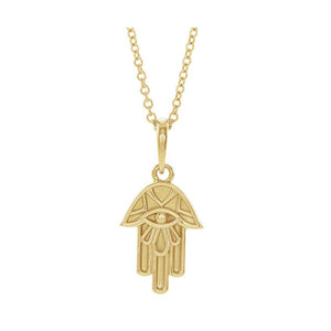 The hamsa hand is a famous symbol in the Buddhist religion but also highly recognized all over the world as a universal sign of protection, power, and strength. This small hamsa hand necklace created from 14k yellow gold features a polished embossed design. The approximate pendant size is 10mm (3/8 inch) in width by 22mm (7/8 inch) in length with the bail. The solid cable chain closes with a spring ring clasp, is 1mm width and adjusts in length from 16 to 18 inches.