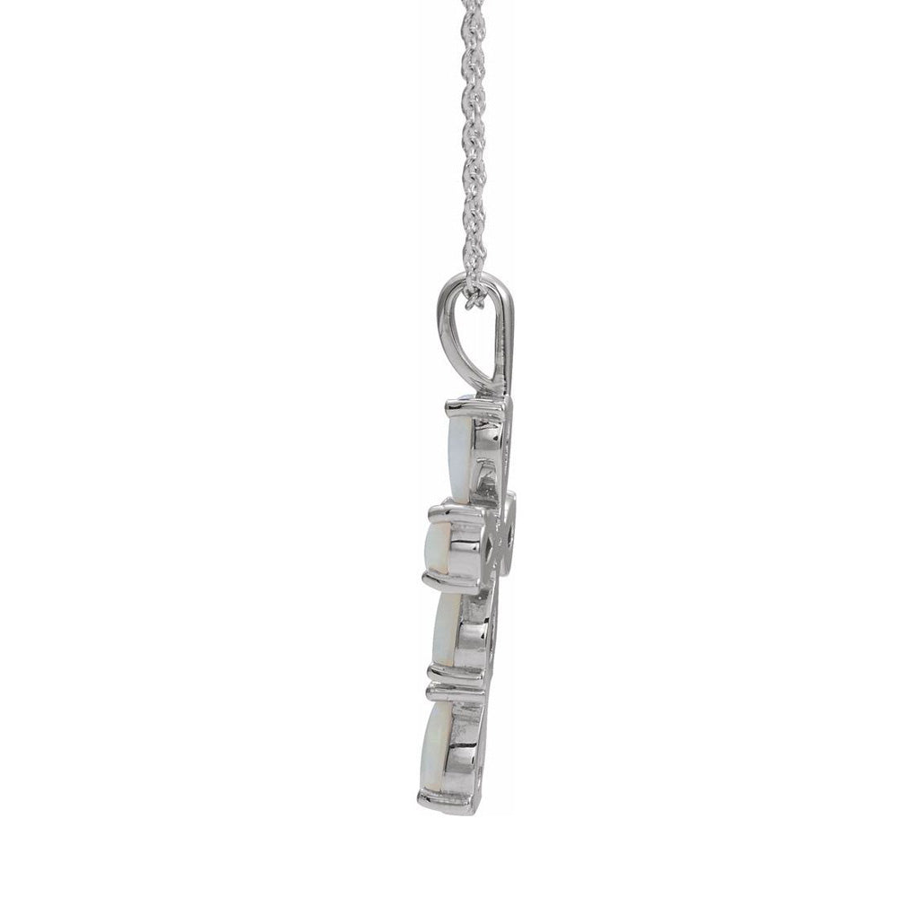 Celebrate and honor all special occasions with jewelry of religious significance! Our collection of spiritually inspired designs that show faith, hope and devotion are perfect for commemorating life's milestones. This adjustable necklace created in rhodium-plated 14k white gold features a 13 x 25mm (1/2 x 1 inch) cross pendant set with genuine white opal cabochons. It hangs from a 1mm width solid cable chain that closes with a spring ring clasp and is adjustable in length from 16 to 18 inches. The color range varies on all genuine gemstones so please allow for slight variations in shades. Gemstone treatment: natural, not enhanced.