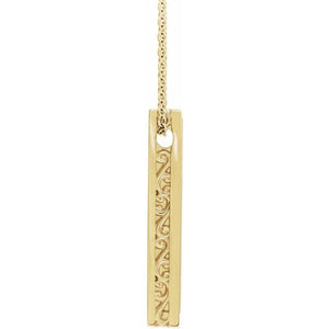 Tie the meaning to the moment with a classic or unusual necklace that makes it personal, thoughtful, or meaningful. This vertical bar slide pendant crafted in 14k yellow gold features an open-back sculpted design with scroll details on the side and a brushed finish. The approximate pendant size is 5mm (3/16 inch) in width by 25mm (1 inch) in length. Includes a 1mm width, 24-inch long, solid cable chain that closes with a spring-ring clasp. Suitable for engraving. This is a made to order item and is estimated to ship in about 6-8 days. Please email service@theblackbow.com for more details.