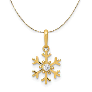 This tiny snowflake charm pendant is crafted from polished 14k yellow gold and it features a single cubic zirconia stone in the center. The approximate size is 8 mm (5/16 inch) in width x 15 mm (9/16 inch) in length with the bail. Includes a 16 inch long, 0.9mm wide, solid 14k yellow gold cable chain with a spring ring clasp.