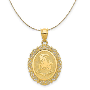 • Capricorn zodiac sign, the Sea-Goat. Confident, determined and reserved, the half goat-half fish tends to push ability to the limit in order to achieve goals. This 17 x 20mm (5/8 Inch x 3/4 Inch) oval pendant features a polished raised relief and textured satin design created from 14k yellow gold. It has a textured back, which is not suitable for engraving and with the tapered bail is approximately 27mm (1 1/16 inch) in length. The pendant is . Includes a 20 inch, 0.8mm 14k yellow gold cable chain with a lobster clasp.