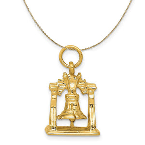 • Add a unique focal point to a classic outfit with this 3-dimensional Liberty Bell pendant. It is fashioned from polished 14k yellow gold and measures approximately 13mm (1/2 Inch) in width by 20mm (3/4 Inch) in length, which includes the chain slide. The pendant is Includes a 18 inch, 0.8mm 14k yellow gold cable chain with a lobster clasp.