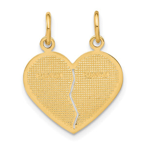 This mom and daughter heart set of 2 charms pendant is crafted with solid 14 karat yellow gold and it features a textured finish with a front and back. The approximate size is 16 mm x 18 mm and its average item weight is 1.44 grams. This item does not include a chain.
