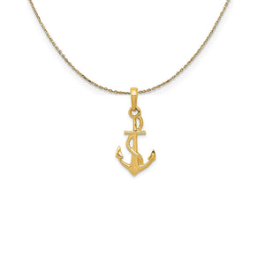 A nautical treasure, an anchor with a textured rope crafted from 14k yellow gold featuring a solid, 3-dimensional design. It measures approximately 13mm (1/2 Inch) wide by 24mm (15/16 Inch) long including the tapered bail. Includes a 16 inch long, 0.9mm wide, solid 14k yellow gold cable chain with a spring ring clasp.