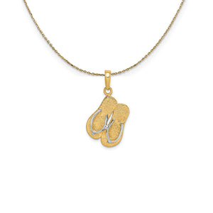 Bring summertime glam to every occasion with this polished and textured sandals pendant fashioned from 14k yellow gold with white rhodium plated straps. It measures approximately 14mm (9/16 inch) wide by 25mm (1 Inch) long, which includes the tapered bail. Includes a 18 inch long, 0.9mm wide, solid 14k yellow gold cable chain with a spring ring clasp.