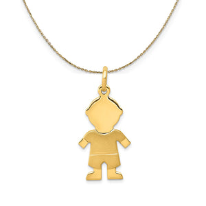 This satin boy pendant is crafted with 14k yellow gold and it features a polished and satin finish and is suitable for engraving. The approximate size is 15 mm x 34 mm and its average item weight is 2.58 grams. Includes a 16 inch long, 0.9mm wide, solid 14k yellow gold cable chain with a spring ring clasp.