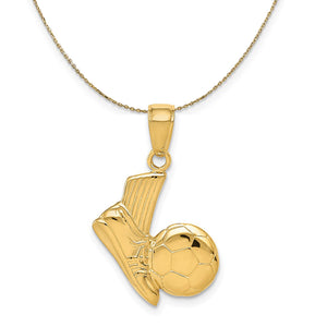 Start conversations wherever you go with a unique charm created to spark interest and reveal your passion for soccer. This polished 14k yellow gold pendant features a two-dimensional open back design that is approximately 16mm (5/8 Inch) in width by 22mm (7/8 Inch) in length, which includes the tapered bail. Includes a 18 inch long, 0.9mm wide, solid 14k yellow gold cable chain with a spring ring clasp.