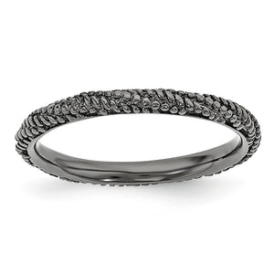 Make it simple and stylish with stackable bands of different textures, finishes, widths and colors! This black ruthenium plated sterling silver band features a textured design with a high polished finish that measures 2.5mm wide. Guaranteed to fit together perfectly with all of the mix and match Stackable Expressions rings.