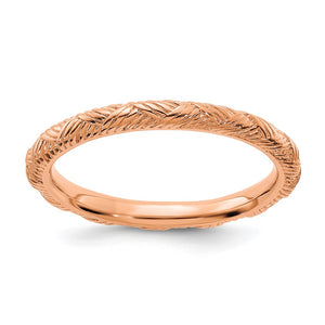 Make it simple and stylish with bands of different textures, finishes, widths and colors! This stackable ring created from 14k rose gold-plated sterling sliver features a polished basket weave pattern. The approximate band width is 2.5mm. Guaranteed to fit together perfectly with all of the mix and match Stackable Expressions rings.