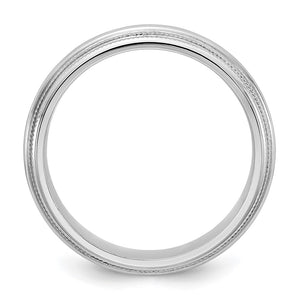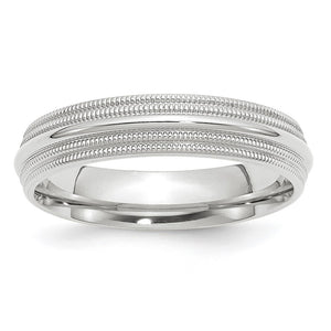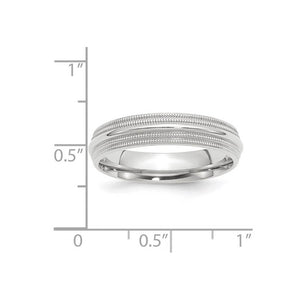 A tried and true favorite style featuring a domed center with double milgrain edges created from rhodium-plated 10k white gold. This polished unisex band has a comfort fit shank, is approximately 2mm in thickness (standard weight) and 5mm in width. Suitable for engraving.�