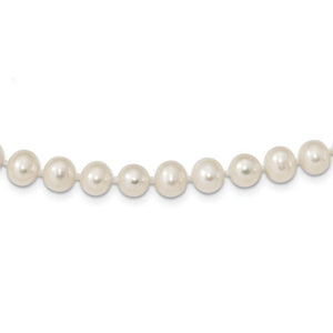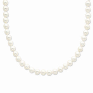 Nothing compares to the beauty and classic sophistication of pearls, the gem of the water and always appropriate. This 18-inch white freshwater cultured pearl necklace features 7 to 8mm near round pearls single knotted by polyester thread and a rhodium-plated sterling silver pearl clasp. Due to the natural of pearls, please allow for slight variations in size and color. Gemstone treatment: bleached.