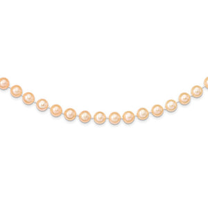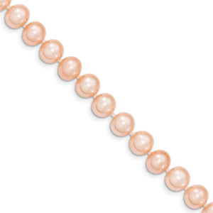 Nothing compares to the beauty and classic sophistication of pearls, the gem of the water and always appropriate. This 18-inch pink freshwater cultured pearl necklace features 8 to 9mm near round pearls single knotted by polyester thread and a 14k yellow gold pearl clasp. Due to the natural of pearls, please allow for slight variations in size and color. Gemstone treatment: dyed.