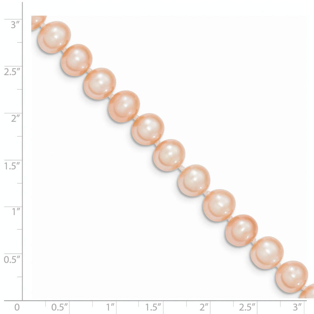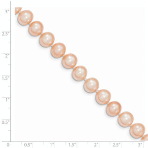 Nothing compares to the beauty and classic sophistication of pearls, the gem of the water and always appropriate. This 20-inch pink freshwater cultured pearl necklace features 8 to 9mm near round pearls single knotted by polyester thread and a 14k yellow gold pearl clasp. Due to the natural of pearls, please allow for slight variations in size and color. Gemstone treatment: dyed.