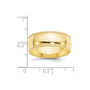 A tried and true favorite style featuring a half round center with milgrain edges created from solid 10k yellow gold. This polished men's band has a standard fit shank, is approximately 1.45mm in thickness and 8mm in width. Suitable for engraving.�