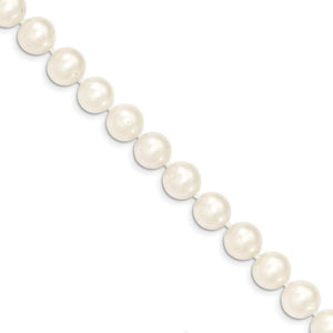 Nothing compares to the beauty and classic sophistication of pearls, the gem of the water and always appropriate. This 18-inch white freshwater cultured pearl necklace features 9 to 10mm near round pearls single knotted by polyester thread and a 14k yellow gold pearl clasp. Due to the natural of pearls, please allow for slight variations in size and color. Gemstone treatment: bleached.