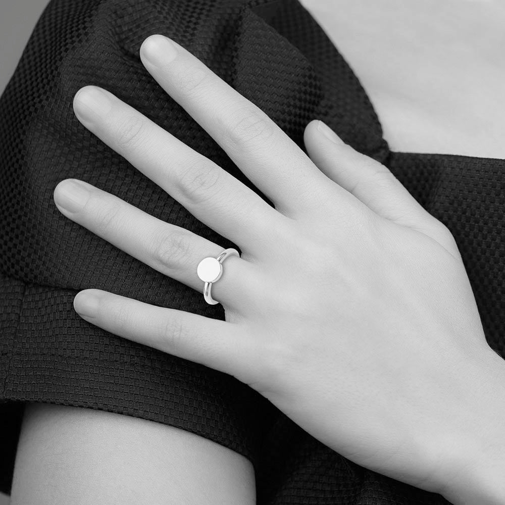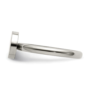 A simplistic yet elegant ring with a geometric style featuring a 9mm (3/8 inch) flat circle design fashioned from polished stainless steel. It has a standard fit and the band is approximately 2. Mm in width. Available in whole sizes only 6-9.