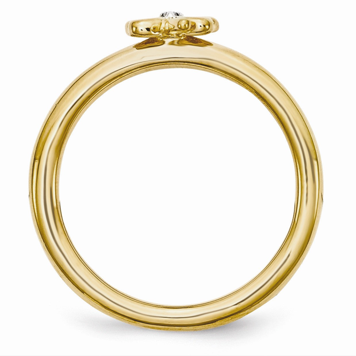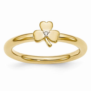 Create a look that is all your own with a fun assortment of rings that looks great alone or stacked in a collection to express your own unique style. This classic style clover ring fashioned from yellow gold tone plated sterling silver features a 6mm diamond accent clover atop a 2.5mm width band. The .05 carat round natural diamond is I2-I3 in clarity and H-I in color. Guaranteed to fit together perfectly with all of the mix and match Stackable Expressions rings.