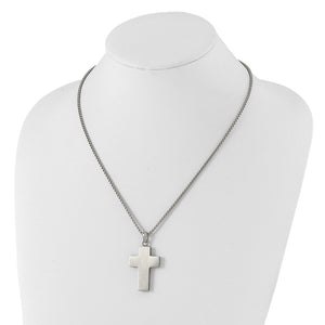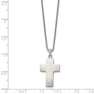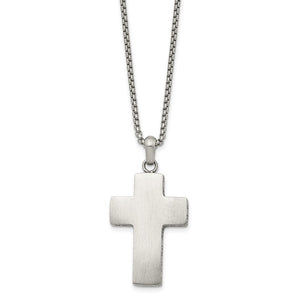 Celebrate and honor all special occasions with jewelry of religious significance! Our collection of spiritually inspired designs that show faith, hope and devotion are perfect for commemorating life's milestones. This men's stainless steel necklace features a brushed cross pendant with a black oxidized edge design that is approximately 25mm (1 inch) in width by 48mm (1 13/16 inch) in length, which includes the bail. It hangs on a 2mm width by 19.75-inch-long rounded box chain that closes with a fancy lobster clasp. Suitable for engraving.