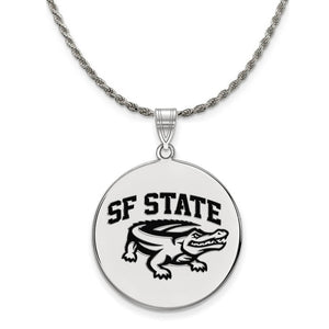 • If you are a fan of San Francisco State University and the Gators then you need to show your school spirit with this San Francisco State University pendant. We are a certified college jewelry retailer and this authentic item is officially licensed. It is crafted from Sterling Silver and crafted by LogoArt in the USA. Includes a flexible and strong diamond cut rope chain. This stunning chain is 2.25mm in width, 20 inches in length and features a sturdy lobster claw clasp. The chain is crafted in Italy.