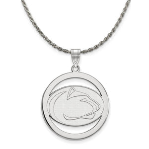 • If you are a fan of Penn State University and the Nittany Lions then you need to show your school spirit with this Penn State University pendant. Approximate size is 26mm (1 inch) in width by 33mm (1 5/16 inch) in length with the bail. We are a certified college jewelry retailer and this authentic item is officially licensed. It is made from rhodium plated sterling silver and crafted by LogoArt in the USA. Includes a flexible and strong diamond cut rope chain. This stunning chain is 2.25mm in width, 26 inches in length and features a sturdy lobster claw clasp. The chain is crafted in Italy.