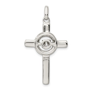 Uniquely set and elegantly imagined. The center stone on this two-tone Celtic cross pendant is designed to move constantly to make it twinkle and shine. It is crafted from platinum and rose tone plated sterling silver with a 4mm and smaller accent cubic zirconia stones. The approximate size is 20mm (3/4 inch) in width by 33mm (1 5/16 inch) in length with the bail. This item does not include a chain.