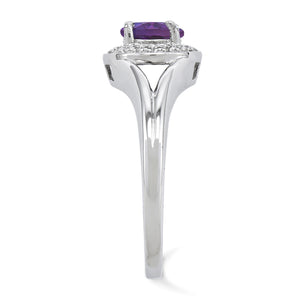 A 6mm faceted amethyst crowns the center of this diamond accented halo style ring. It is designed from sterling silver with a rhodium plated finish to retain its bright gleaming appearance. Top width is approximately 9mm (3/8 inch). The two natural diamonds are H-I in color, I2-I3 in clarity and the total diamond weight is .1 of a carat. The color range varies on all natural stones so please allow for slight variations in shades.
