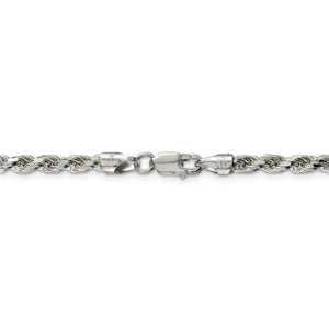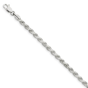 Rope chain bracelets made of twisted and braided sterling silver enhanced with diamond-cuts are extremely popular because they offer a classy design with maximum shine. Flexible and strong, this elegant chain measures 3.5mm in width by 7-inches in length and features a solid link construction with a reliable lobster claw clasp.