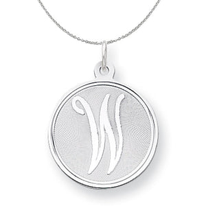 The 20mm (3/4 inch) brocaded disc with its contrasting satin and polished design adds a touch of glamour to your favorite initial. It is fashioned from solid sterling silver, finished with a classic jump ring that fits up to a 3mm width chain and has a polished back that is suitable for engraving. Includes a 1.25mm, 20 inch sterling silver cable chain.